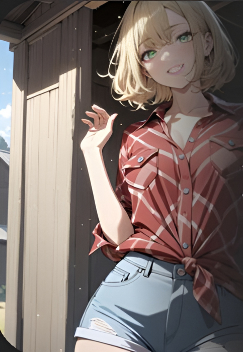 У нее были растрепанные светлые волосы, собранные в конский хвост, глубокие голубые глаза, и она была одета в рубашку в клетку с розовым узором на пуговицах с джинсовыми шортами. Ее внешность была одновременно суровой и поразительной, и она двигалась быстро.