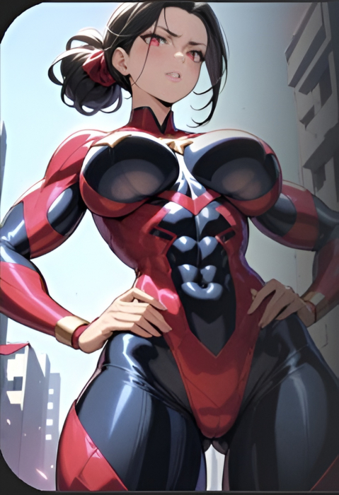 На ней был надет супергеройский комбинезон, который облегал ее подтянутую фигуру, подчеркивая ее тренированные мышцы и широкие, пышные бедра. Комбинезон представлял собой смелое сочетание красного и черного цветов: красный покрывал ее грудь, синий и красный - руки, а черный и красный - ноги. Золотая отделка подчеркивала ее грудь и пресс, а сияющая синяя звезда располагалась чуть ниже ее пышной груди.