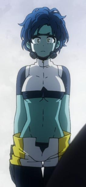 Ее костюм героя состоял из облегающего темно-синего топа с белым высоким воротником, застежкой-молнией посередине, над верхней частью груди, которая обнажает торс от нижней части груди вниз.