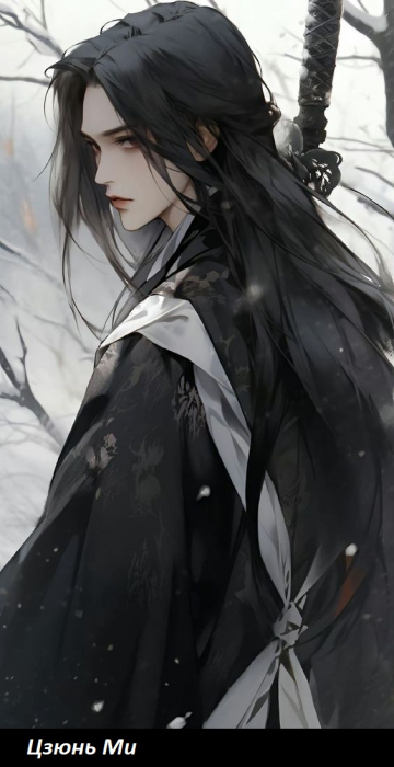 Он был одет в белый короткий ханьфу, держа меч за спиной и сложив руки на груди. Высокий хвост бил по ветру, откидывая пряди ему на лицо.