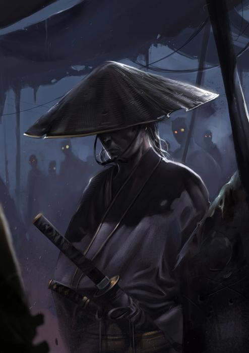 Я же просто стоял у стенки и смотрел на людей. Один из них сильно отличался. Соломенная шляпа с длинными и острыми краями. Порезанные руки, явно не от готовки, ведь его пальцы были грубы и мозолисты. Суровый взгляд, катана на спине. Самурай - первое слово, что приходило при взгляде на него.
