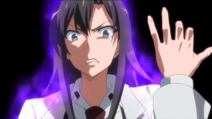 На крыше дома притаилась небывалой красоты девушка. В одной её руке был длинный меч, а в другой кусаригама, цепь которой девушка держала в зубах. На незнакомке было надето короткое розовое кимоно, едва справлявшееся сокрытием её удивительно объёмного бюста. Да и с прикрытием нижней части оно справлялось из рук вон плохо, открывая вид на край нижнего белья. Спортивные ножки незнакомки были обтянуты длинными фиолетовыми чулками. Учитывая одно только это, девушку можно было счесть богиней. Но по-настоящему меня заворожили её зигзагообразные, похожие на молнии, брови и бездонные фиолетовые глаза, от которых я просто не мог отвести взгляд.