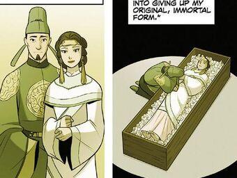 Чтобы быть с возлюбленным, Тиенхай решила навсегда остаться в образе человека, даже если это означало отказ от бессмертия. Она вышла замуж за принца и прожила с ним свою человеческую жизнь. Тиенхай умерла, и уже переродилась кем-то другим. Примерно в это же время Аватар Янгчен освоила четыре стихии. То есть все события произошли пятьсот лет назад, так как после милой Янгчен идёт лентяй Курук, жёсткая Киоши, я-не-смог-победить-вулкан-Року, и замерший во льду Стив Родж… кхм Аанг Монахович.