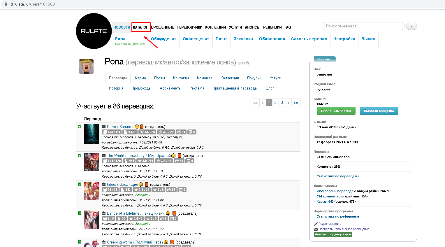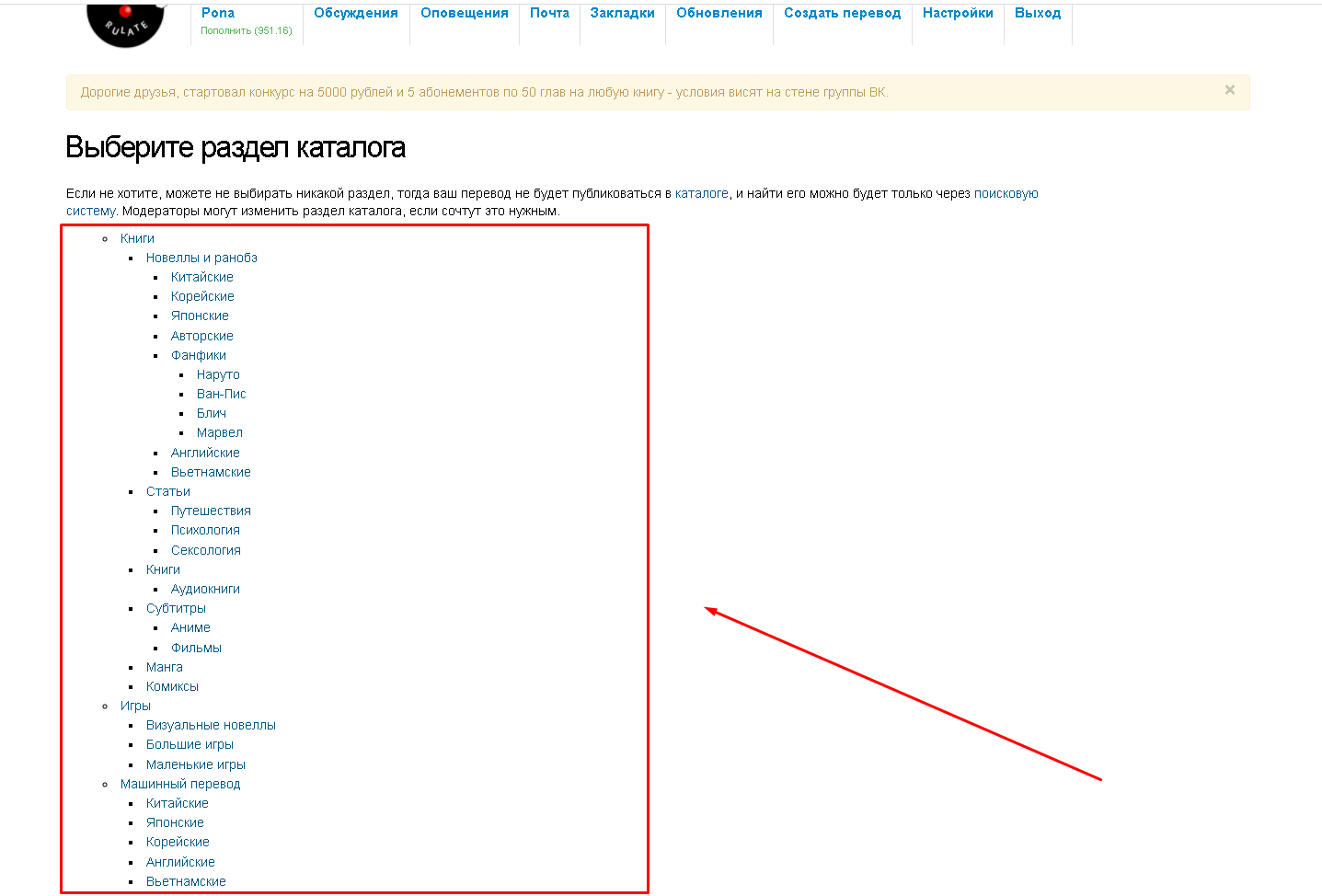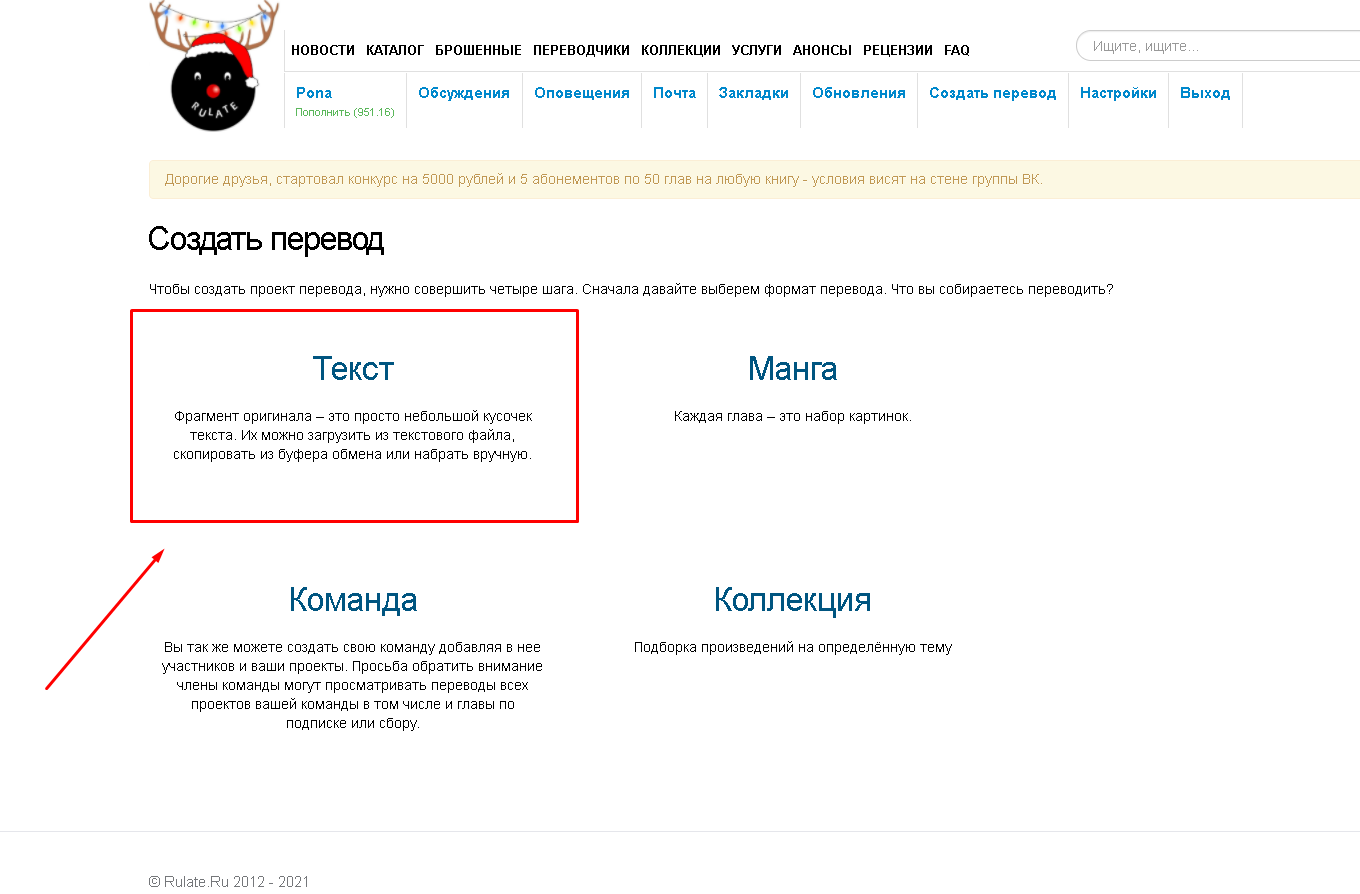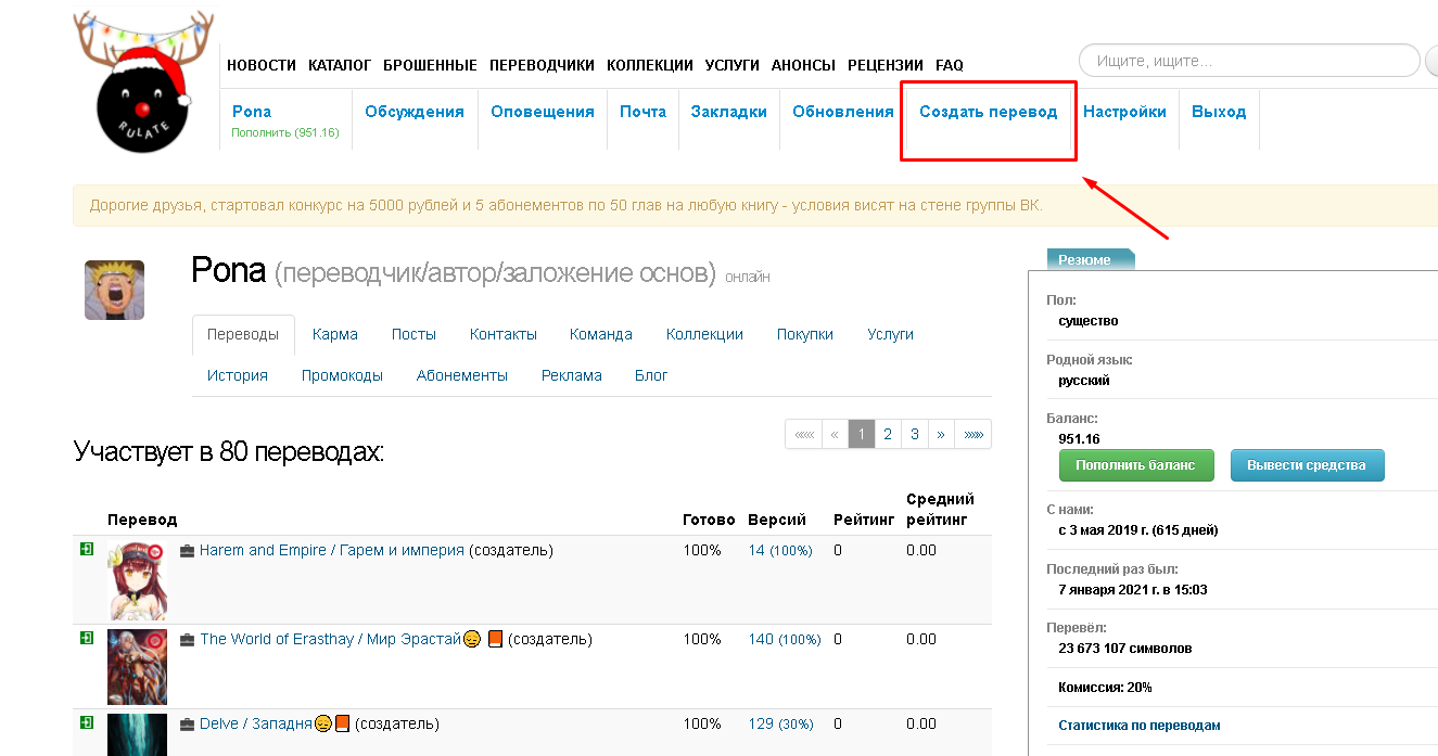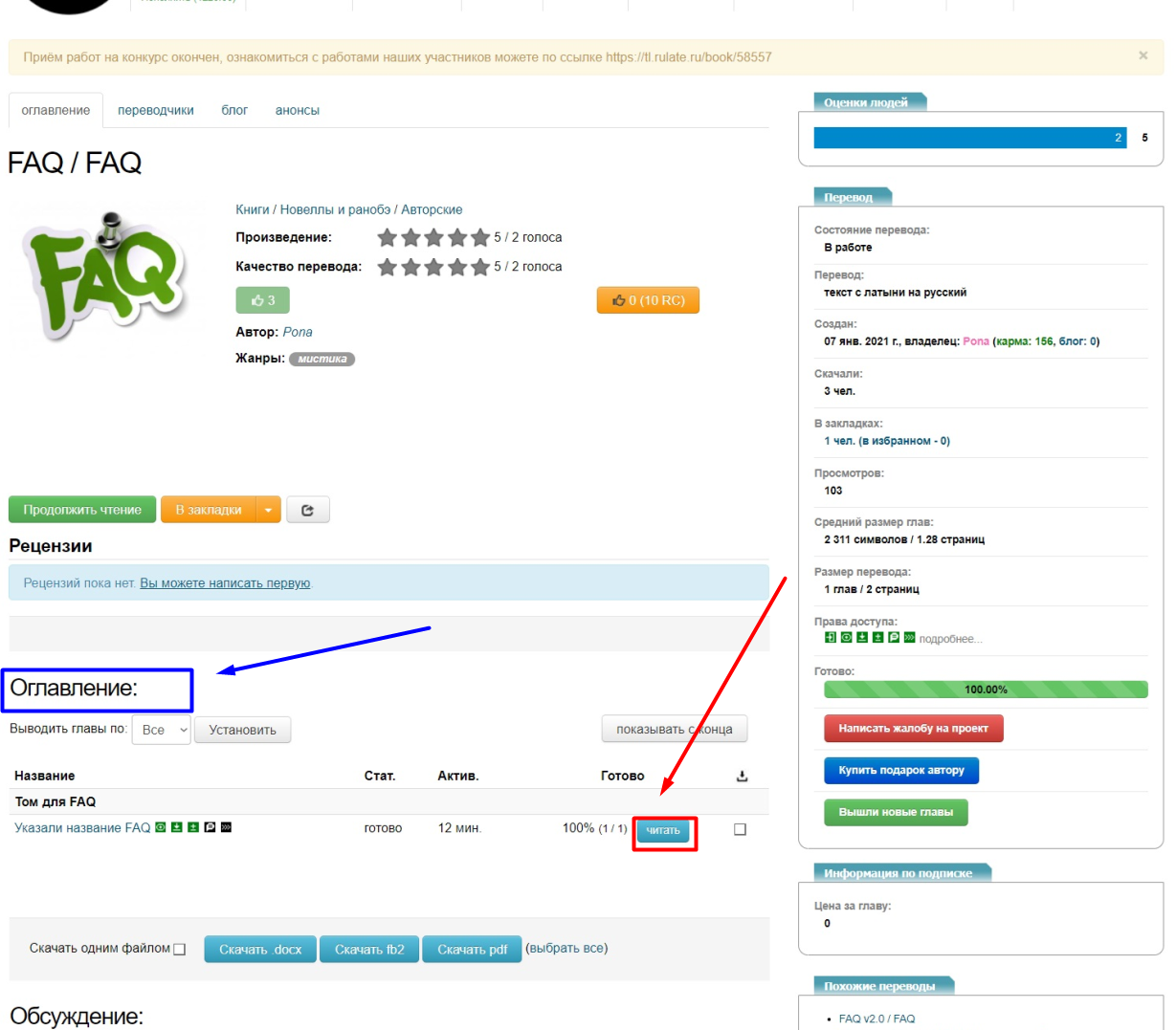 » переводит пользователя на страницу читаемого им проекта, где он может выбрать том и главу рассказа. Кнопка по центру, «