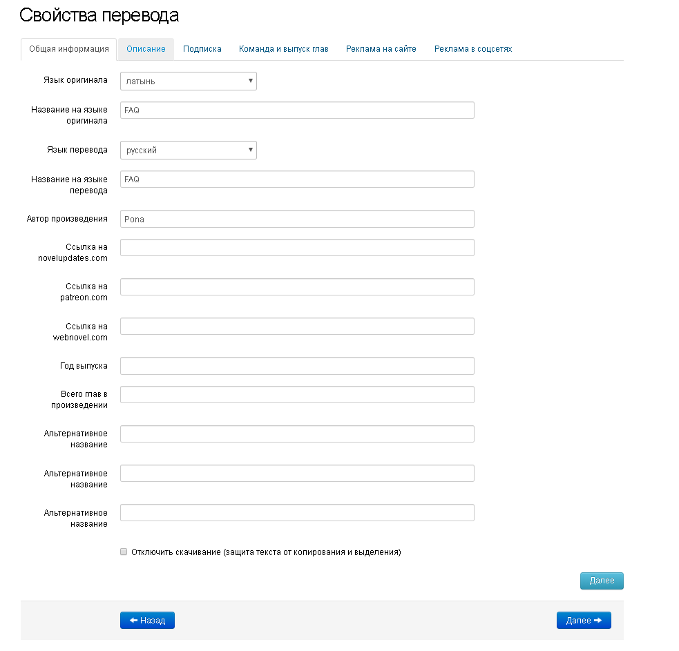 1. «Общая информация»: в этой вкладке вы указываете название на английском, автора, название на языке перевода, год выпуска, количество глав, альтернативные названия, источники.