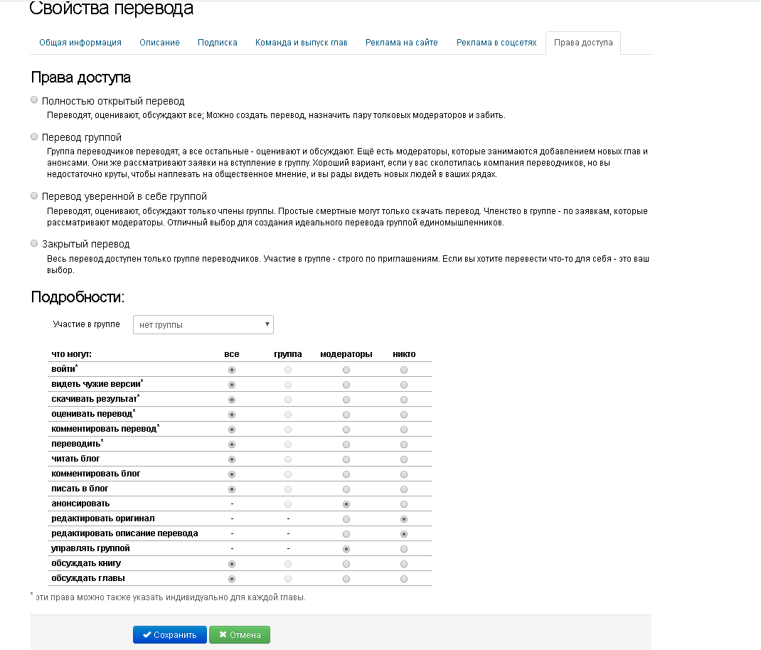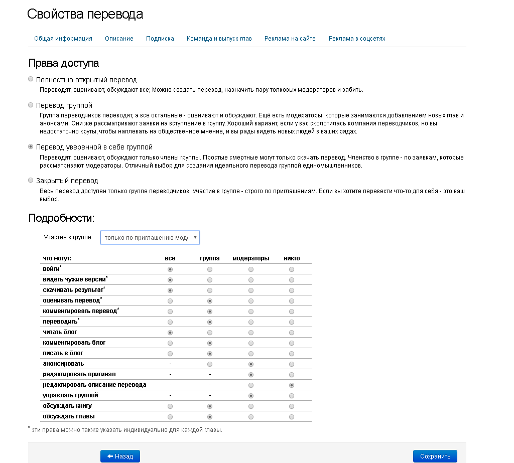 7. Перейдя на вкладку «Права доступа» вы можете настроить права доступа к вашему переводу других пользователей, выбрав 1 из 4-х предложенных статусов. Предоставить или ограничить права участников в вашем переводе, а также изменить способ вступление участников в ваш перевод.