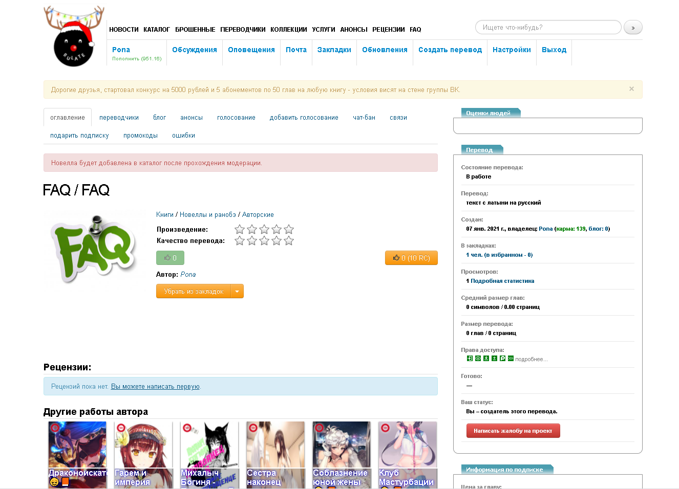 «Вывести в рекомендации (50 руб/день)» Это вид рекламы доступен для всех работ, с возрастным ограничением и без. Воспользовавшись этой рекламой, переводы попадают на главную страницу сайта отображаясь в бегущей ленте, вместе с такими же рекламируемыми работами.