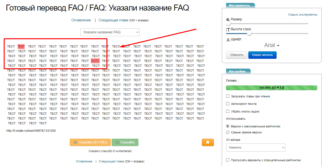 В розовой зоне(Скрин №3, №4) располагается сам текст доступный для чтения. Если глава не была заполнена, по умолчанию, всем пользователям, в розовой зоне, будет отображаться название главы и адресная строка на главу.