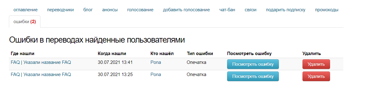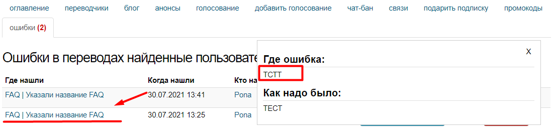 Перейдя в подменю «Ошибки» (Скрин№2) откроется список, благодаря которому можно понять в какой главе ошибка, когда нашли, кто нашел, тип ошибки. Также там есть две активные кнопки, посмотреть ошибку «