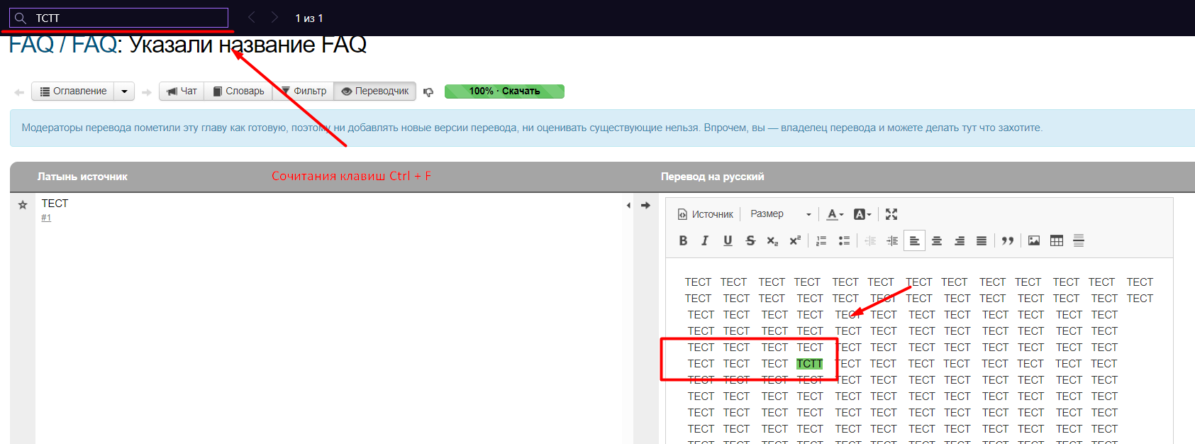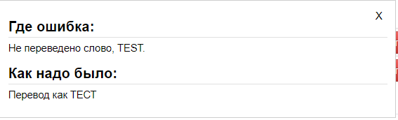 На Скрин №1, в зоне, обведенной красным прямоугольником, отображены 2 ошибки, не переведенное слово «TEST» и неправильно написанное слово «ТСТТ». Чтобы создатель проекта узнал об их наличии, пользователю необходимо совершить ряд процедуры.
