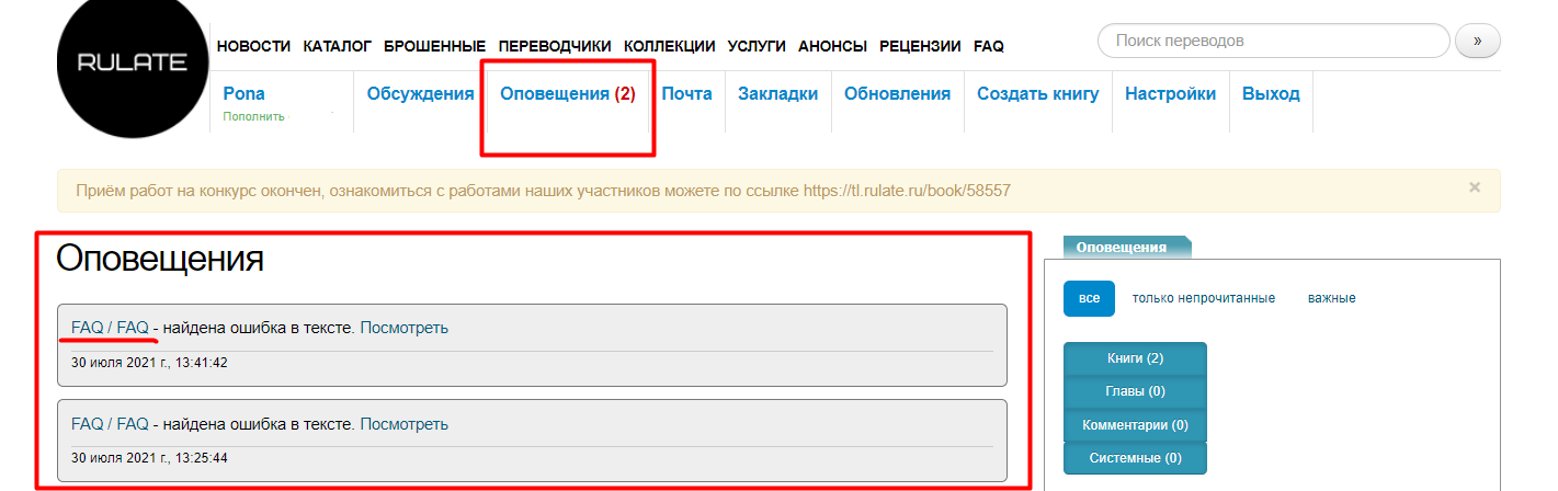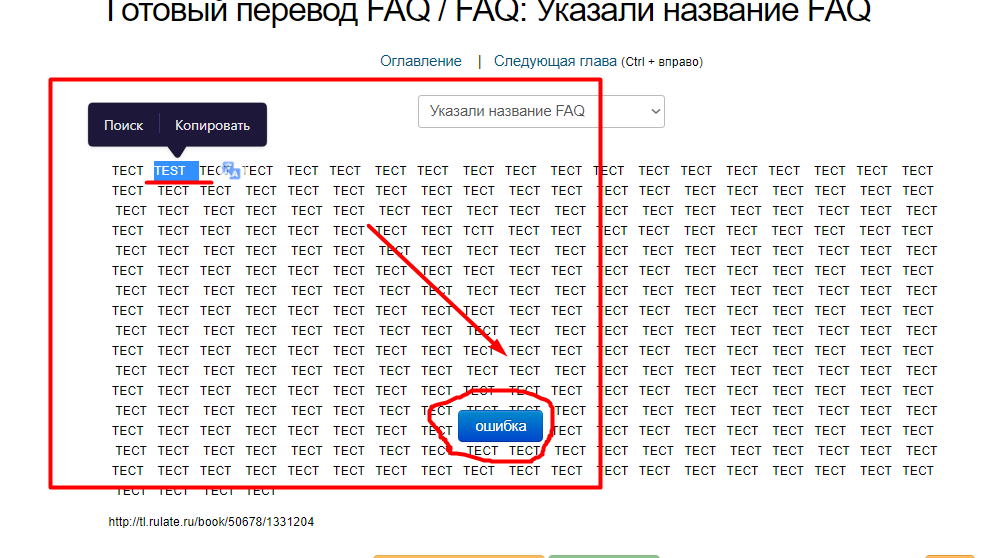 На сайте tl.rulate.ru, во всех читалках (Подробнее о читалках смотреть в разделе FAQ О читалке) реализована возможность указания ошибки создателю читаемого пользователем проекта. Как это сделать, рассмотрим в примере.