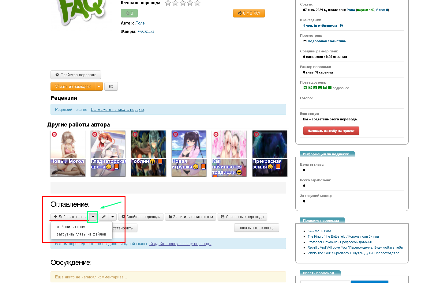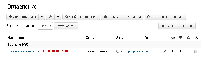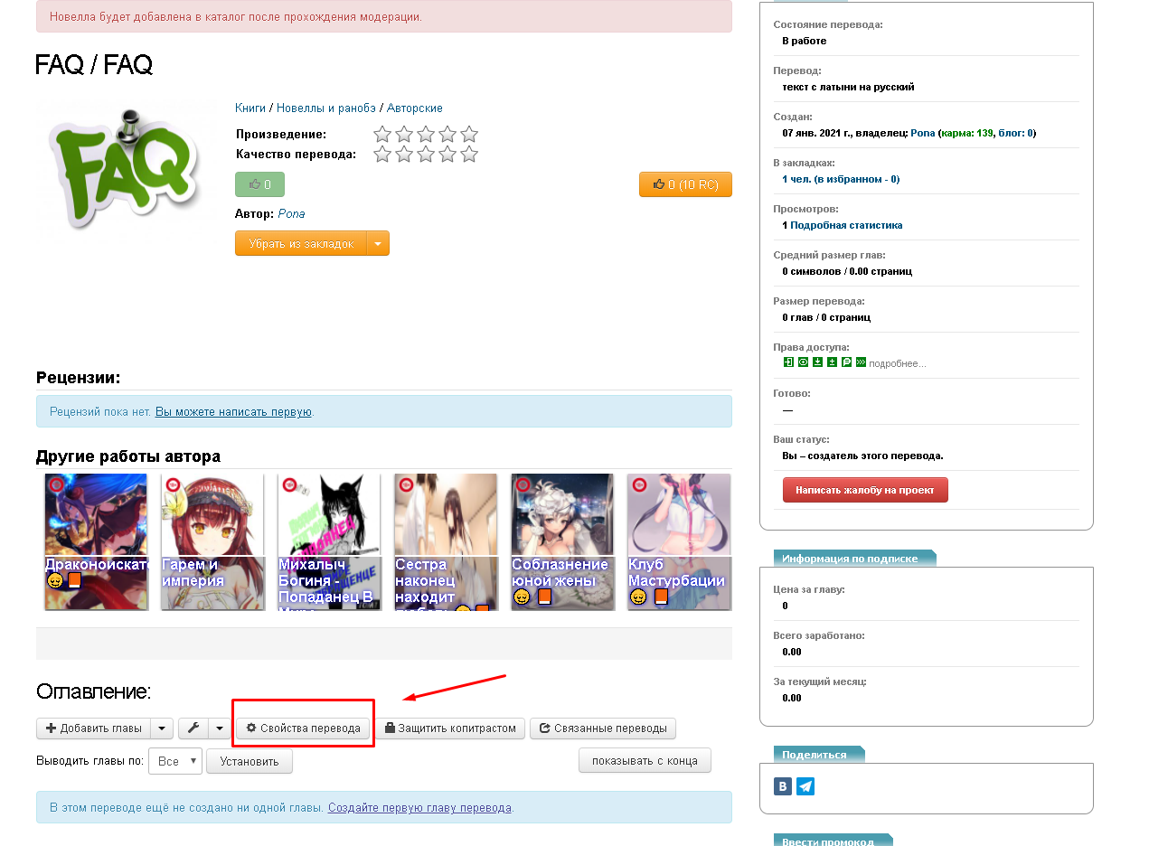 После того как, пользователем был создан перевод (подробнее о создании перевода смотрите в разделе FAQ Как создать перевод на сайте tl.rulate.ru) и сделаны все необходимые настройки в его свойствах (подробнее о свойствах перевода смотрите в разделе FAQ Свойства перевода) можно перейти к добавлении первой главы: