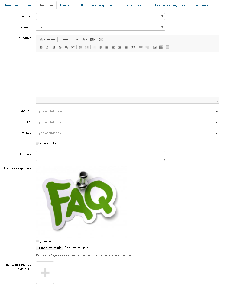 2. Во вкладке «Описание» вы указываете состояние выпуска, наименование команды, которая выполняет перевод (если необходимо), описание. Здесь же вы можете отредактировать или добавить тэги/жанры/фэндомы (подробнее смотрите в разделе FAQ "Тэги / жанры / фэндомы"), загрузить обложку, которая будет отображается на странице оглавления, а также можете добавить дополнительные картинки, которые будут периодически менять друг друга на странице перевода.