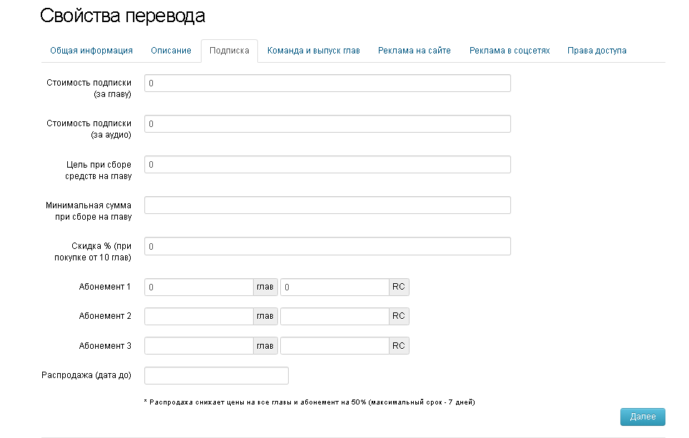 3. Во вкладке «Подписка» можно указать стоимость за главу, сумму для сбора средств (цель которого можете описать в названии главы с включенным сбором средств), скидку в процентах при массовом (больше 10) закупе глав. Так же в этой вкладке доступна настройка трёх абонементов, где вы сами можете указать цену за количество глав к примеру: в первом указать 25 глав за 25RC (в этом случаи читатель купит 1 главу за 1RC), а во втором абонементе 50 глав за 40RC (в этом случаи читатель купит 1 главу за 0,8 RC). Ниже абонементов расположен пункт Распродажи, указав дату до какого числа желаете устроить распродажу (не более 7 дней), ваша работа появится на главной странице сайта внизу, в бегущей строке распродажа, стоимость всех ценников в работе, опустится на 50% на срок распродажи.