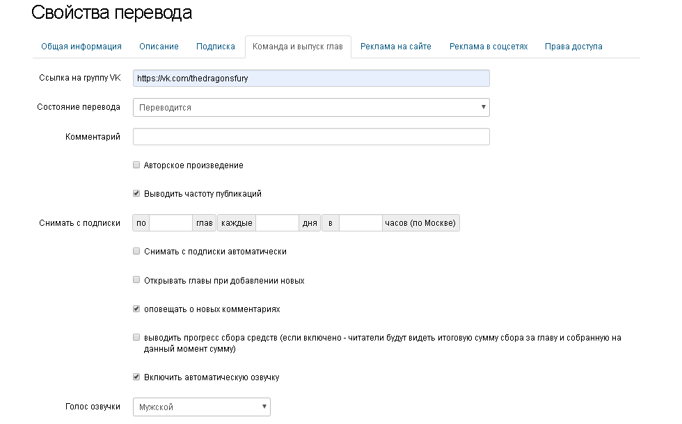4. Во вкладке «Команда и выпуск глав» можно указать ссылку на вашу команду в соц. сети ВК, состояние перевода или авторской работы (вы можете выбрать из списка состояний тот что больше подходит к работе на данное время), добавить короткий комментарий к состоянию вашей работы, указать период через сколько будет бесплатная глава, открыть доступ к озвучке вашей работе, указав желаемый голос.