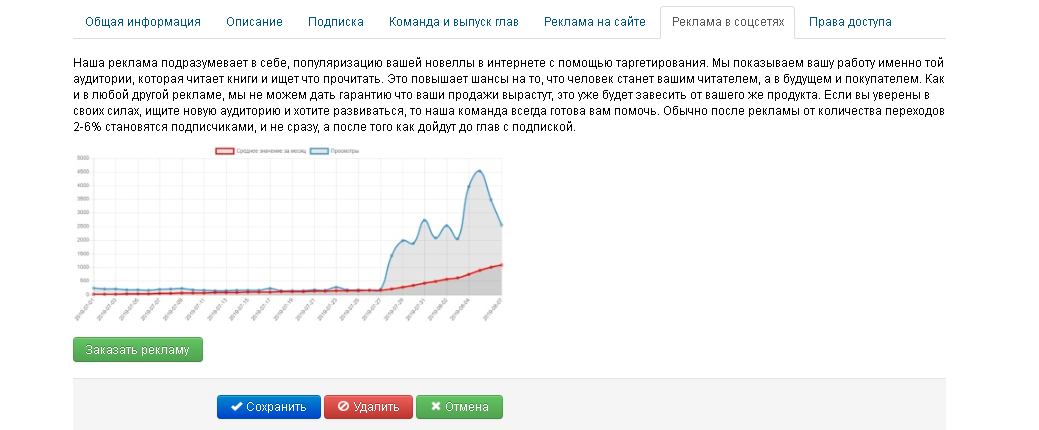 6. Во вкладке «Реклама в соцсетях» можно популяризировать ваше произведения за приделами нашего сайта. Подробнее о рекламе смотрите в разделе FAQ Реклама вашего рассказа