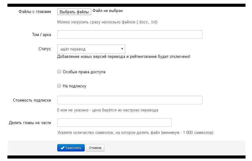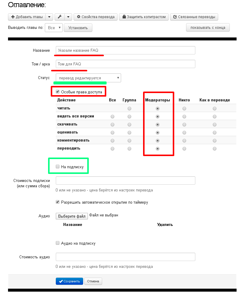». Перед нами всплывет меню настройки главы, где можно настроить Название главы, Том/арку, статус главы, указать Особые права доступа к главе, указать о взыскании платы выставив галочку в пункте На подписку, задать Стоимость подписки, при наличии аудио версии переведенной главы, можно указать Аудио подписку и Стоимость аудио.