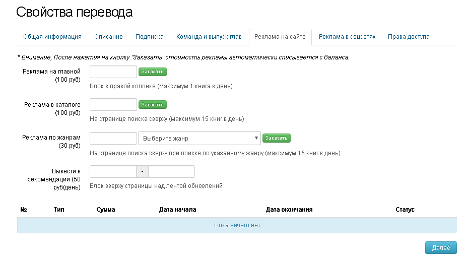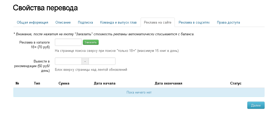 В свойствах перевода (подробнее о свойствах перевода смотрите в разделе FAQ Свойства перевода) есть две вкладки, «Реклама на сайте» и «Реклама в соцсетях»
