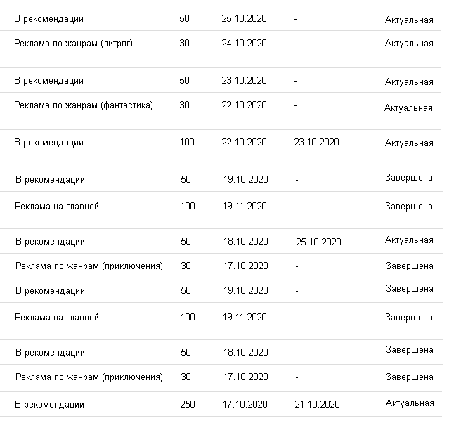 Все текущие, прошедшие и запланированные рекламы на сайте, отображаются в меню пользователя «Реклама».