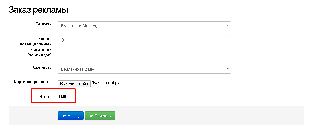 В форме, стоит указать, где будет публиковаться работа, желаемое количество переходов на вашу работу с социальной сети и желаемый темп набора этих переходов. Так же стоит выбрать картинку, это картинка будет публиковаться в нашей социальной сети. После выбора всех желаемых параметров, в пункте «Итого» автоматически изменится цена, если пользователь согласен с итогами, необходимо нажать кнопку "Заказать".
