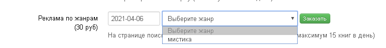 «Реклама по жанрам (30 руб)» Это более точная реклама, для отображение пользователям что ищут работы конкретного жанра. В параметрах необходимо указать дату, и выбрать жанр, из указанный в описании свойств перевода (подробнее о свойствах перевода смотрите в разделе FAQ Свойства перевода), в котором будет проводиться реклама.