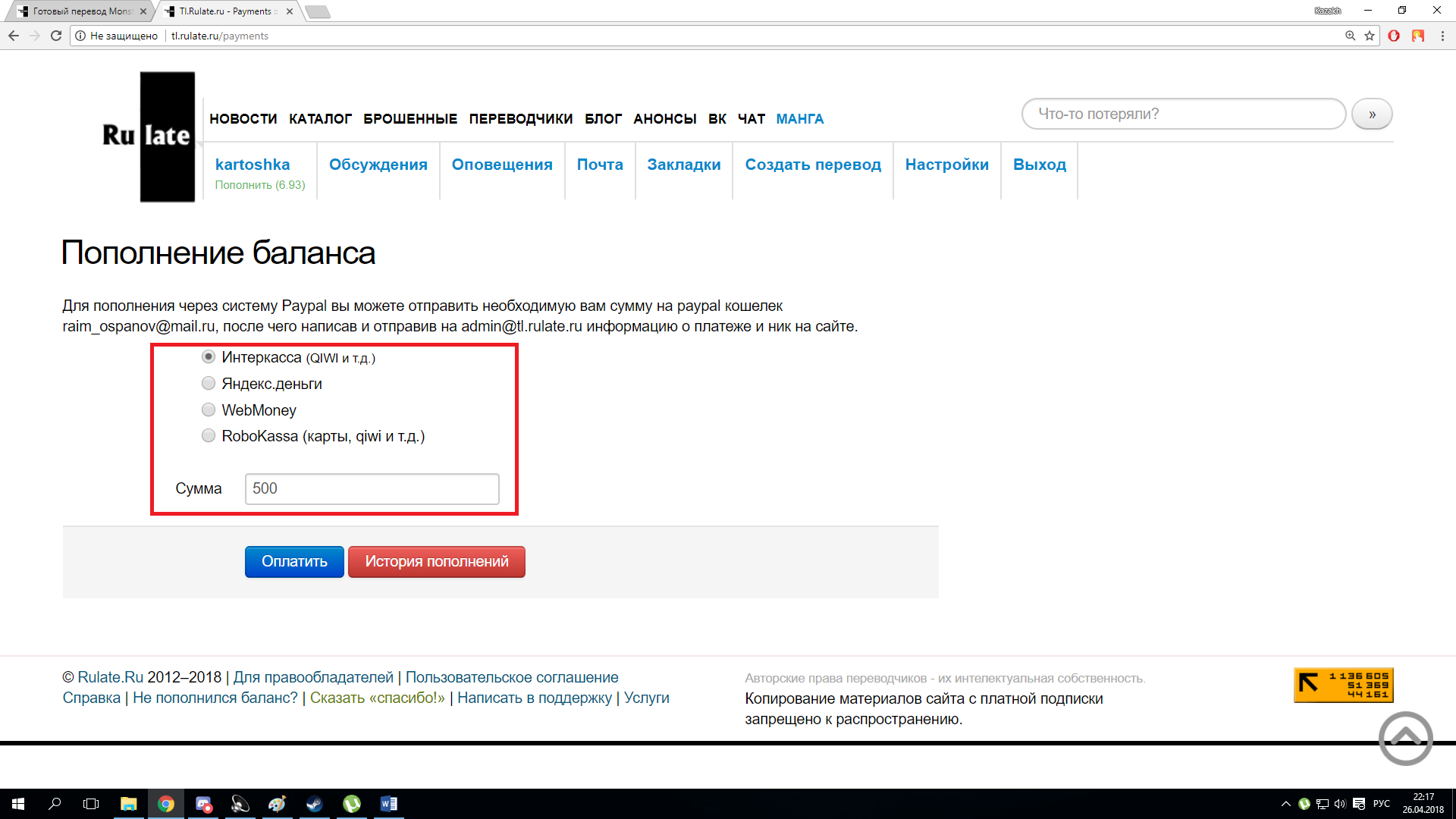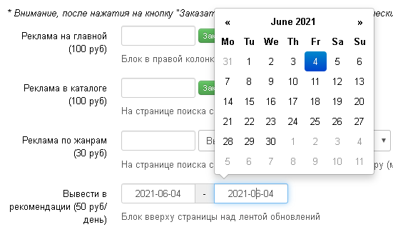 «Реклама на сайте», позволяет выбрать вид рекламы на сайте, ее длительность в днях. Если в работе нет возрастных ограничений, то доступно такие виды рекламы как сбоку на главной странице, реклама в каталоге, реклама по жанрам, реклама на главной странице в бегущей строке «Реклама» над лентой обновлений.