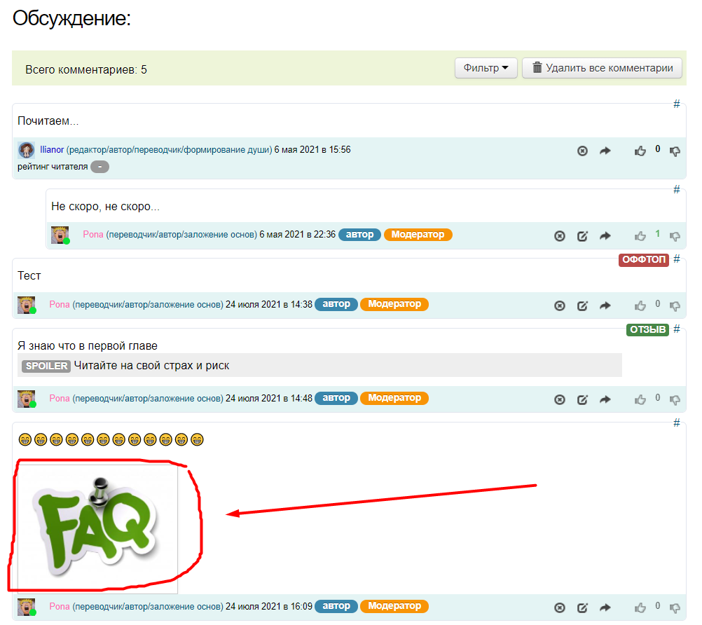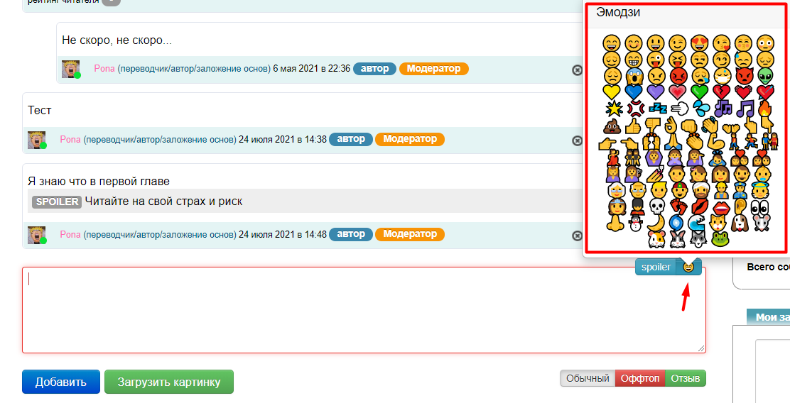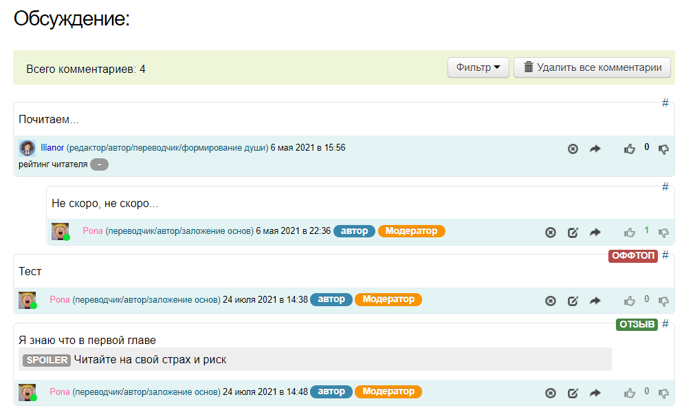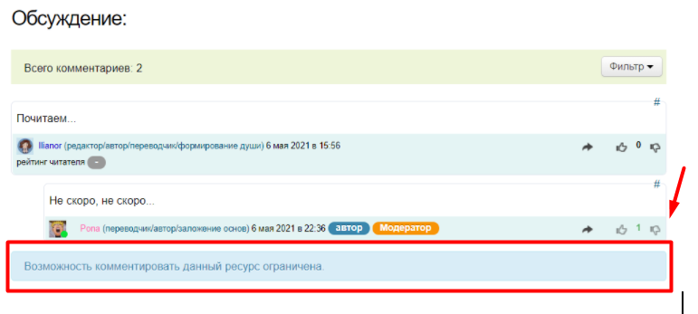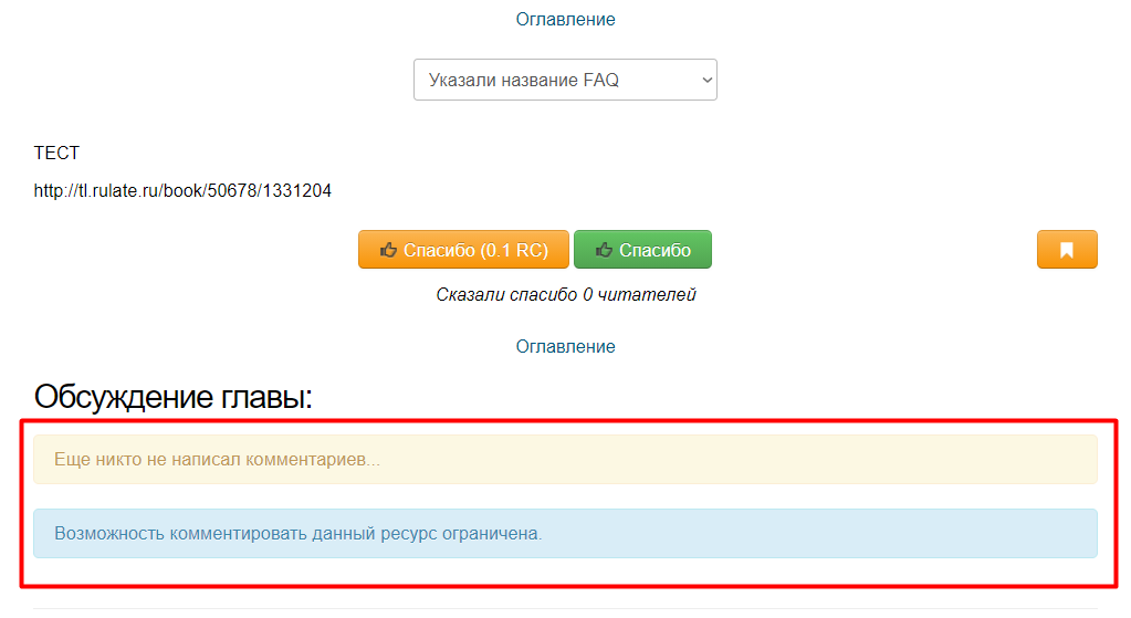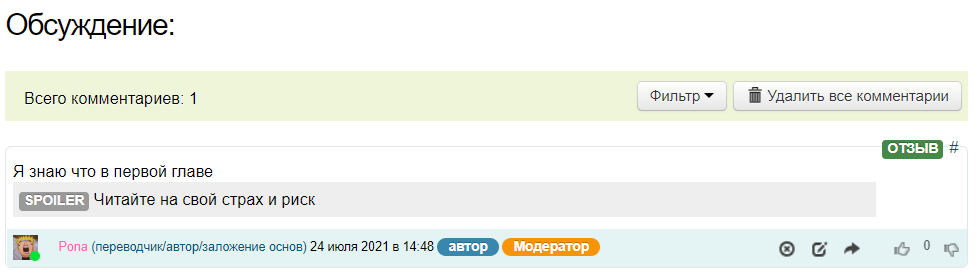 Ниже, находится функционал обсуждение главы, где пользователь может оставить свой комментарий. (подробнее о комментариях смотрите в разделе FAQ Комментарии)