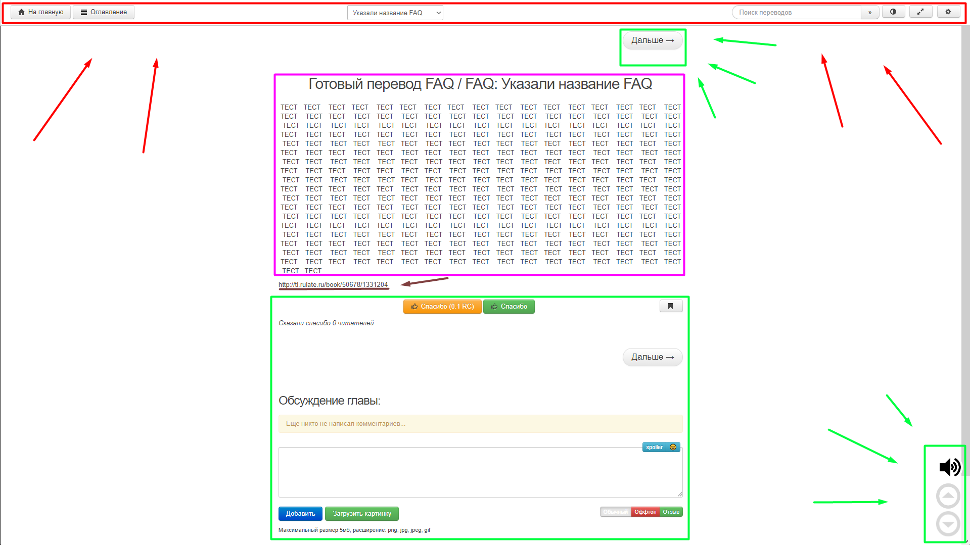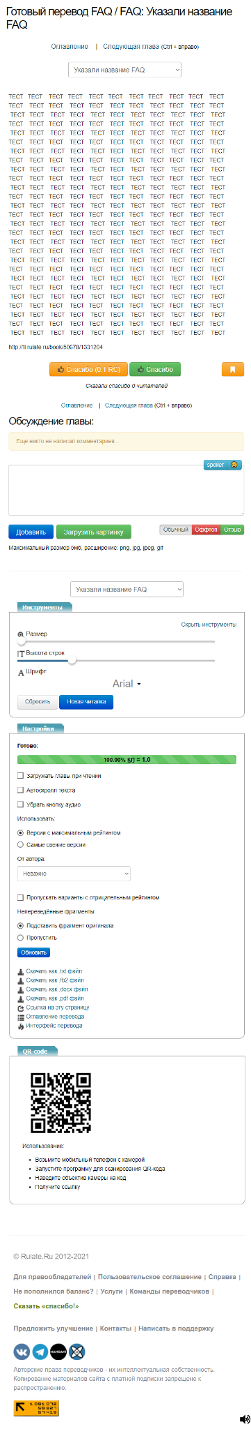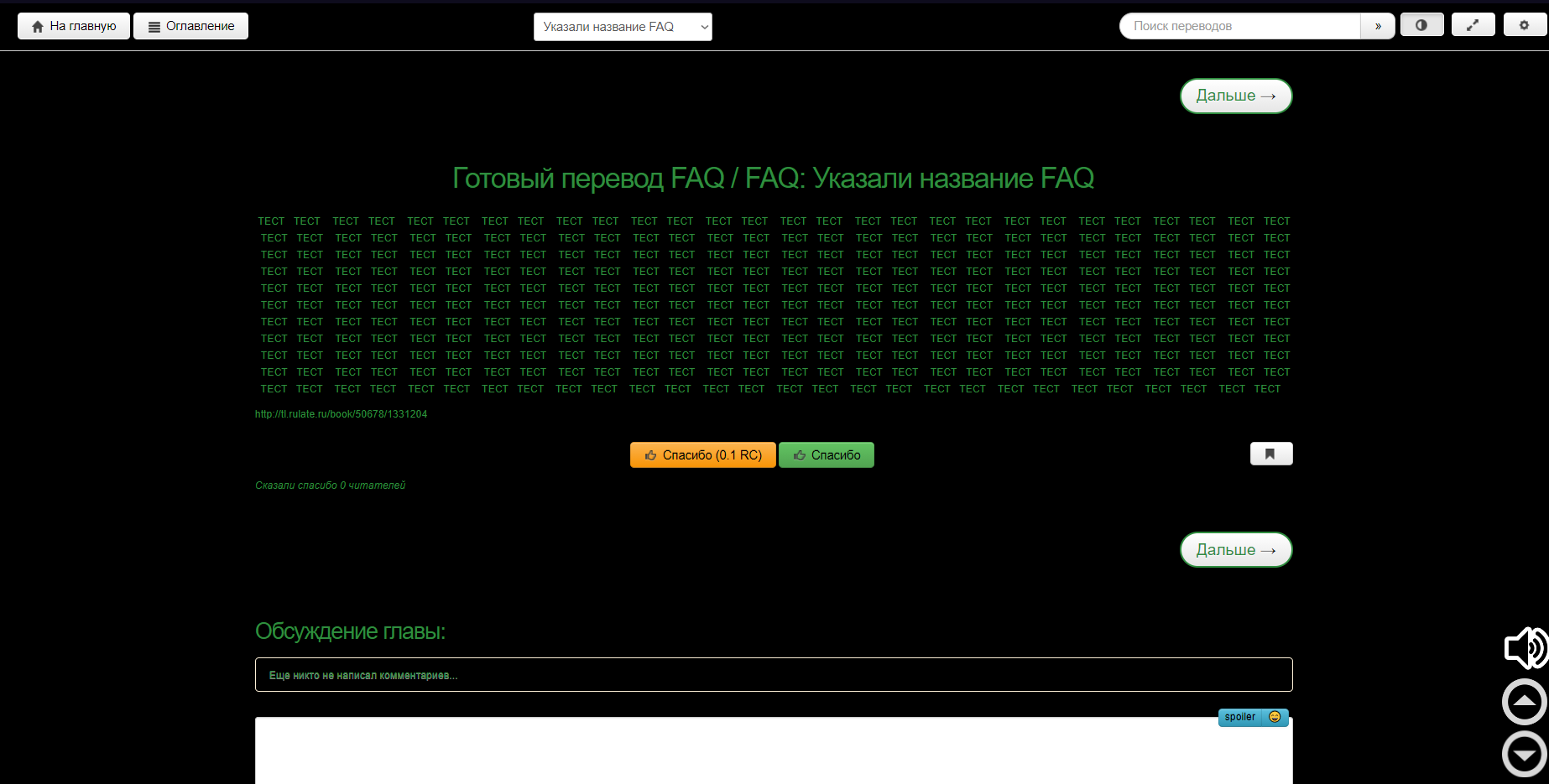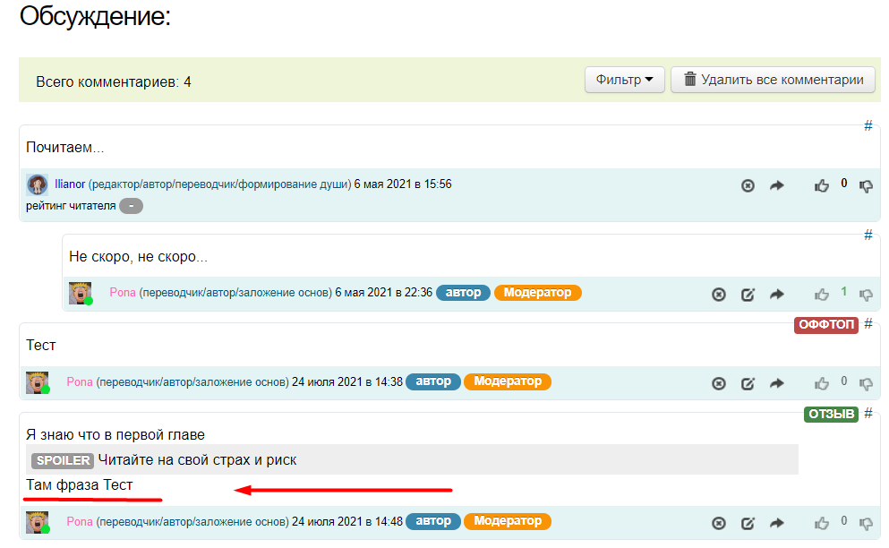 Ниже, находится функционал обсуждение главы, где пользователь может оставить свой комментарий. (подробнее о комментариях смотрите в разделе FAQ Комментарии)