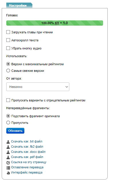 Также В блоке настроек, можно выбрать версию перевода, и автора перевода (при условии если таковые есть).