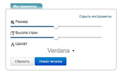 Функционал «Инструменты» новой читалки (Скрин №4), позволяет изменять внешность отображаемой страницы, (подробнее о внешности отображаемой страницы смотрите в разделе FAQ Дизайн под себя) размер и тип шрифта. Кнопкой «