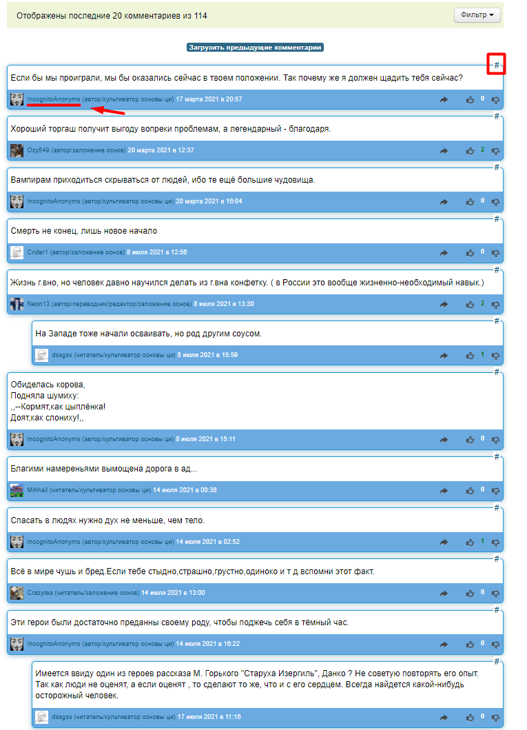 » нажимаем «#» и нам, в центр экрана выводит последующий комментарий этого пользователя вплоть до последнего в интересующем вас обсуждении.