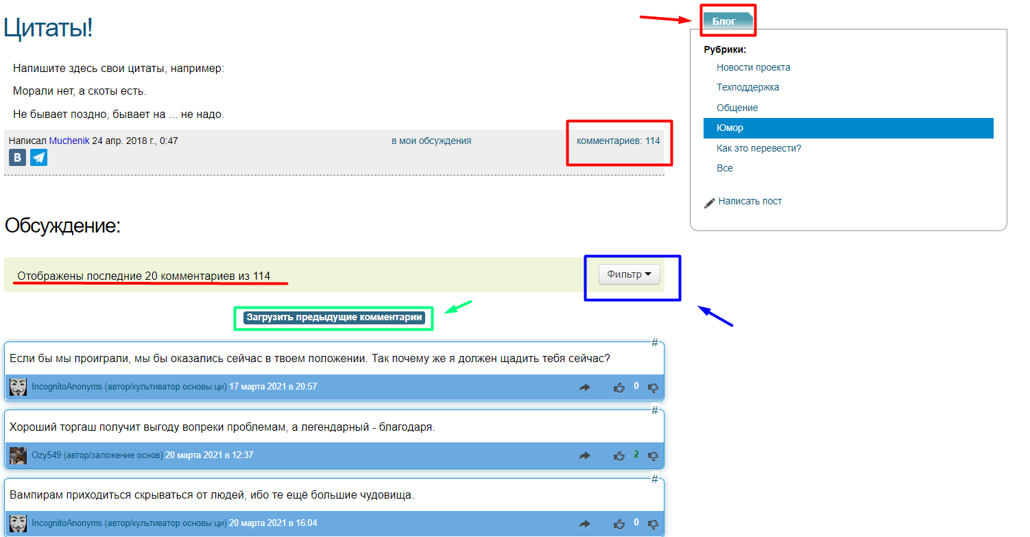 На скриншоте №1 отображен блог «Цитаты!». На момент использования его в качестве примера, в нем было 114-ть комментариев. По умолчанию, сайт выводит лишь 20-ть последних комментариев, это решение позволяет ускорить загрузку страницы, и сэкономить интернет трафик.